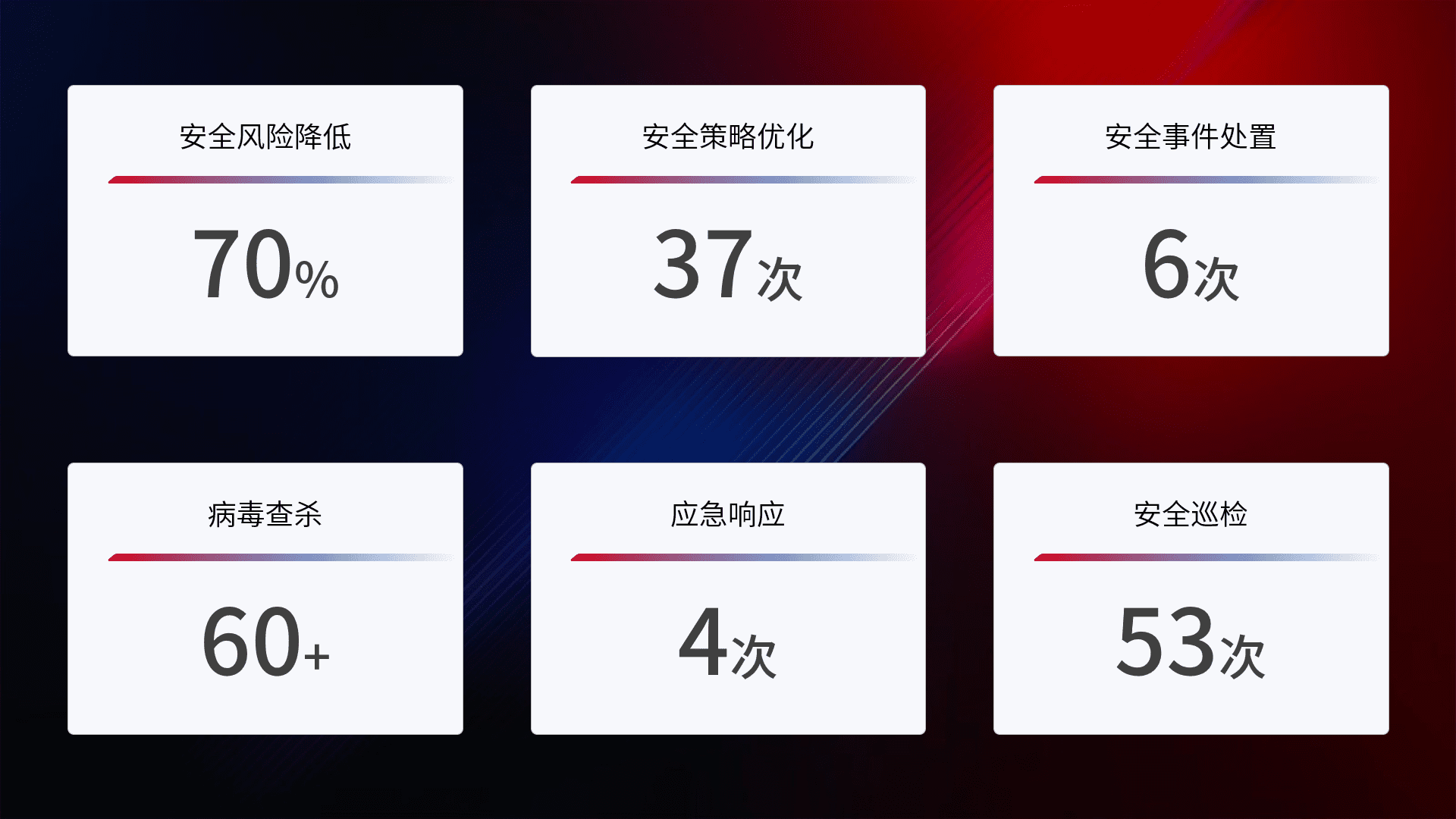 提供全面的安全事件报告体系,,,包括处置报告、、、、周报、、季度和年度总结,,,结合持续监控,,帮助客户深入了解网络安全状况。。。