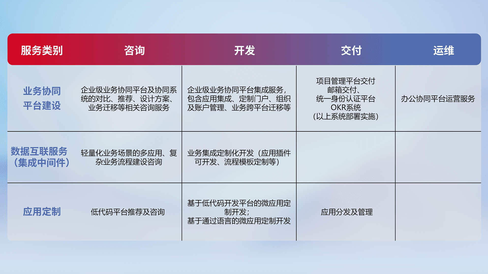 针对钉钉、、企微、、、、IDaas等平台级产品提供产品的规划、、方案、、交付、、、定制化开发等服务,,实现如统一协同办公、、智能客户服务、、、混合会议管理、、智能数据查询、、、、等业务场景,,,,实现数字化转型。。。。